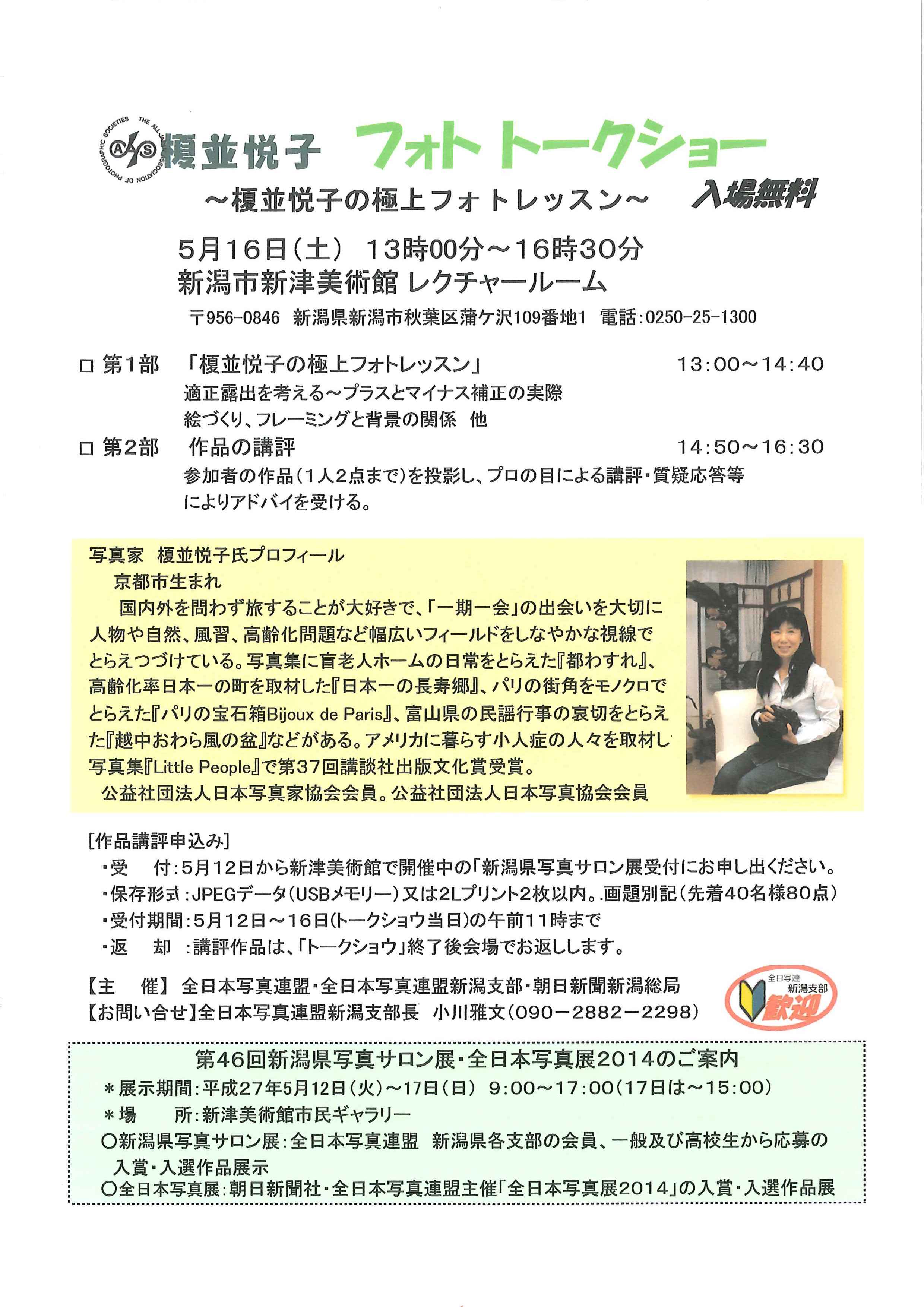 5月16日(土)に新潟市新津美術館レクチャールームにて、極上フォトレッスン13:00~&講評会14:50~があります。入場は無料です。