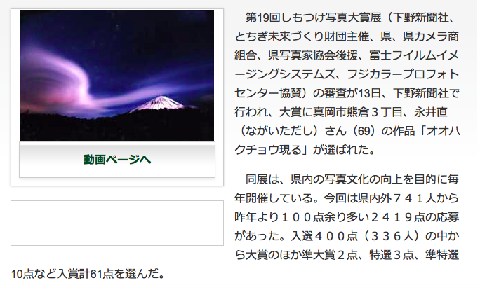 明日(5月7日)は第19回「しもつけ写真大賞:の表彰式(13:00~)です。表彰式終了後、私の記念講演もあります。お近くの方は是非いらして下さい。栃木県総合文化センター・サブホール。また12日までは入選作品展を開催しています。(記事は下野新聞HPより)