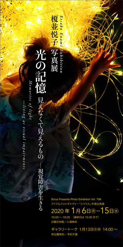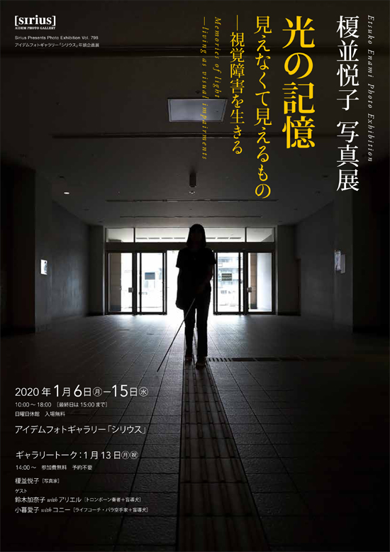 ・期間 2020年1月6日(月)-1月15日(水) ・AM10:00~PM6:00 最終日はPM3:00まで ・日曜休館/入場無料 ・アイデムフォトギャラリー「シリウス」 〒160−0022 東京都新宿区新宿1-4-10アイデム本社ビル2F アイデムフォトギャラリー「シリウス」年頭企画展 ギャラリートーク 1月13日(月・祝) PM2:00〜 写真家 榎並悦子 ゲスト 鈴木加奈子with アリエル (トロンボーン奏者/盲導犬 ) 小暮愛子with コニー(ライフコーチ・パラ空手家/盲導犬) アイデムフォトギャラリー「シリウス」年頭企画 |